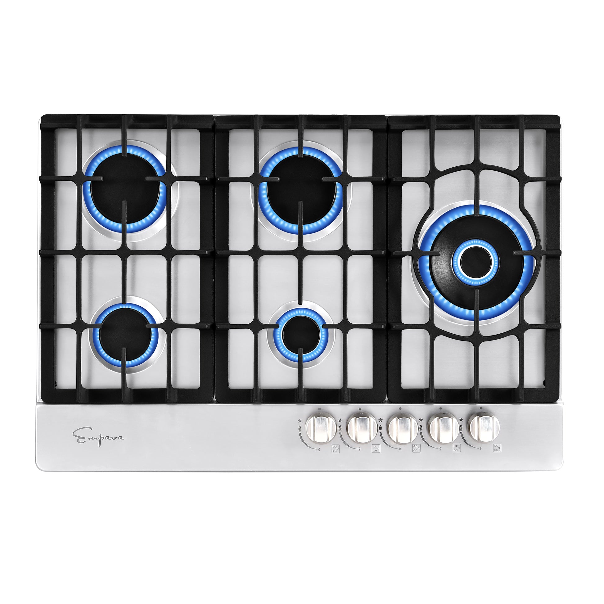 - The Empava 30 inch Built-in Gas Stove Cooktop is designed for versatile cooking, supporting both LPG and NG energy sources to fit your kitchen setup. It features up to five burners of varying sizes, allowing precise temperature control for different cooking needs. With powerful outputs of 18,000 BTU, 12,000 BTU, 9,500 BTU, and 6,000 BTU, this cooktop delivers a wide range of heat suitable for everything from rapid boiling to gentle simmering. Its built-in design ensures a sleek, integrated look while providing professional-grade performance for everyday meal preparation.
