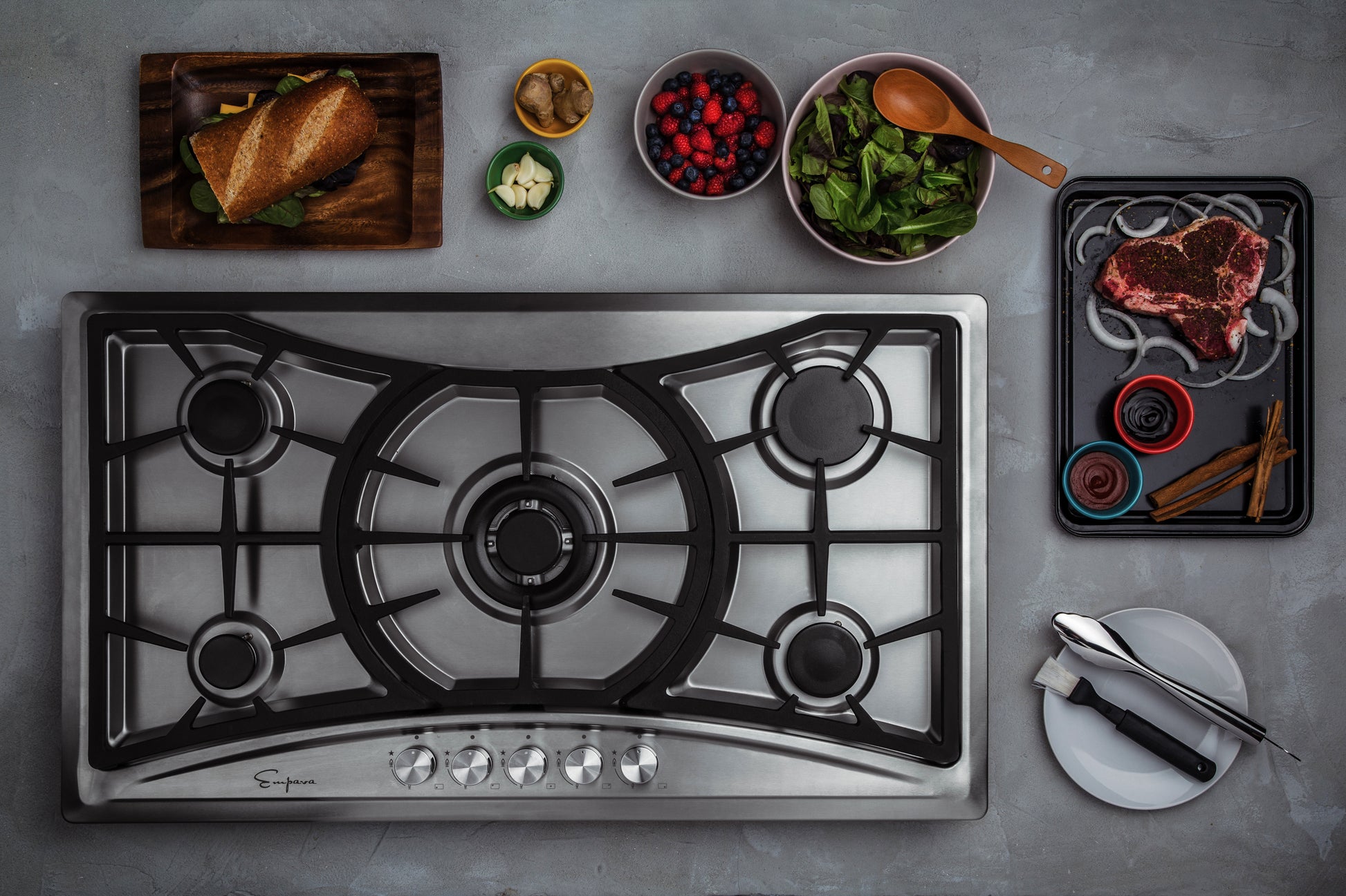 - The Empava 36 inch Built-in Gas Cooktop is designed for versatility and powerful performance, supporting both LPG and natural gas (NG) energy sources to fit diverse kitchen setups. Featuring up to five burners of varying sizes, it provides precise cooking control for different culinary needs. The cooktop includes high-output burners delivering 13,000 BTU for rapid boiling, a 10,200 BTU burner for general cooking, a 6,000 BTU burner for simmering, and a 3,800 BTU burner ideal for low-heat tasks. This range of power options enhances efficiency, allowing you to optimize heat distribution and cooking speed for various dishes.