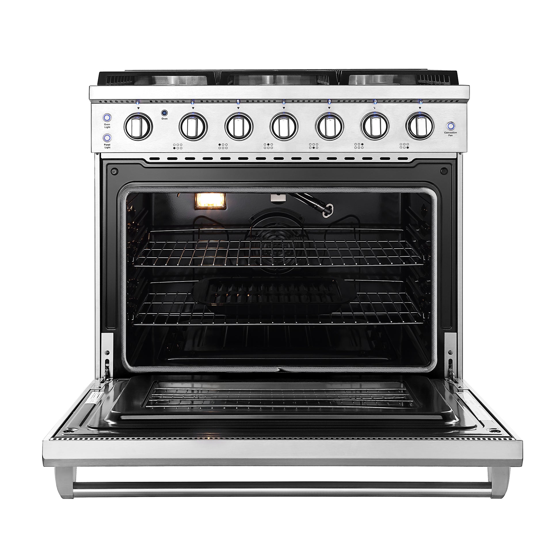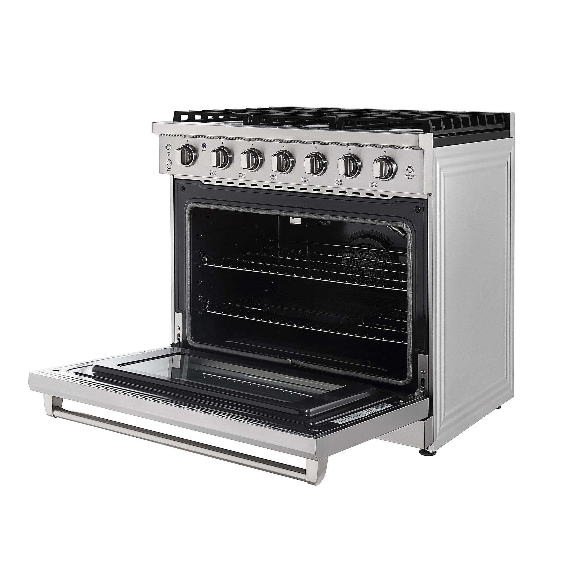 - The Empava 36 inch Pro-Style Slide-in Single Oven Gas Range offers powerful cooking flexibility with six burners ranging from 9,000 to 18,000 Btu, ideal for preparing meals for a large family or entertaining guests. Its automatic reigniting system ensures burners stay lit safely and consistently, while the anti-tip back bracket provides enhanced stability and peace of mind during use. Designed to accommodate any kitchen layout, this versatile range supports freestanding, slide-in, or island installations, blending professional performance with convenient adaptability to elevate your cooking experience.
